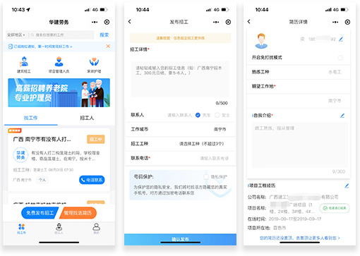 華建勞務小程序是中國東信開發建設的一站式高效招工找活輕量級服務平臺,與行業平臺桂建通、云建寶、新薪通、慧康養、智桂通對接,工人實名認證后可授權華建勞務平臺獲取相關行業平臺認證的工作履歷,快速形成真實、可信的個人簡歷;用工方在華建勞務小程序發布招工信息一次,可同步到華建勞務的多個信息分發渠道,覆蓋用戶規模超6000萬。